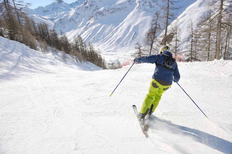 Лыжник на склоне горы, солнечный день
