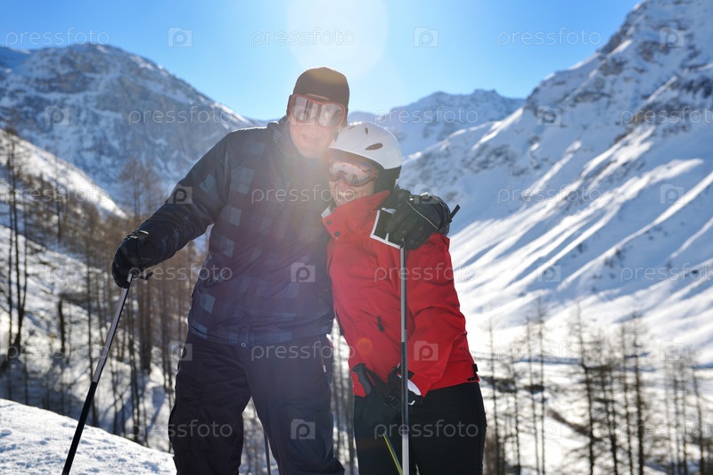 Лыжники на склоне горы, солнечный день