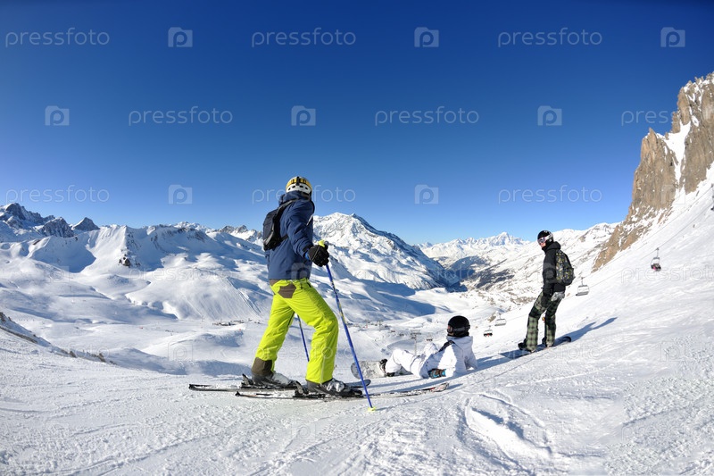 Лыжники на склоне горы, солнечный день