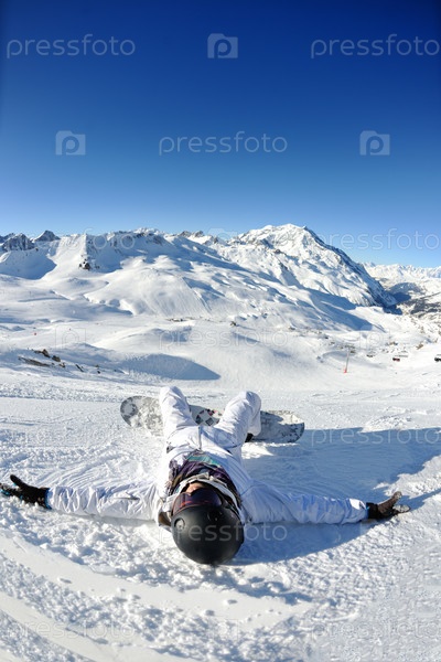 Сноубордистка отдыхает на склоне горы