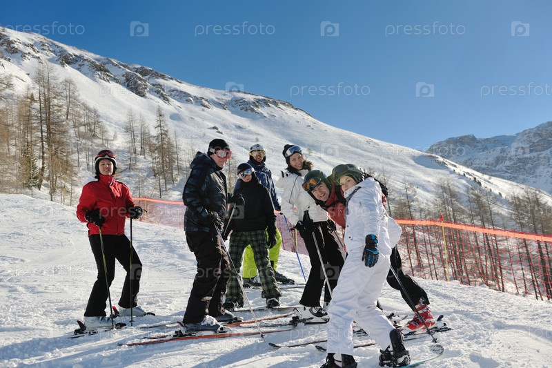 Группа счастливых молодых людей на горнолыжном курорте