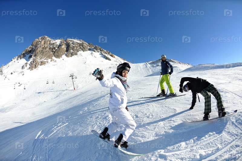 Группа счастливых молодых людей на горнолыжном курорте