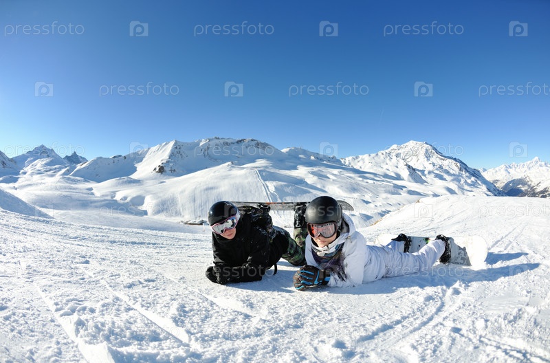 Молодые люди лежат на снегу в горах