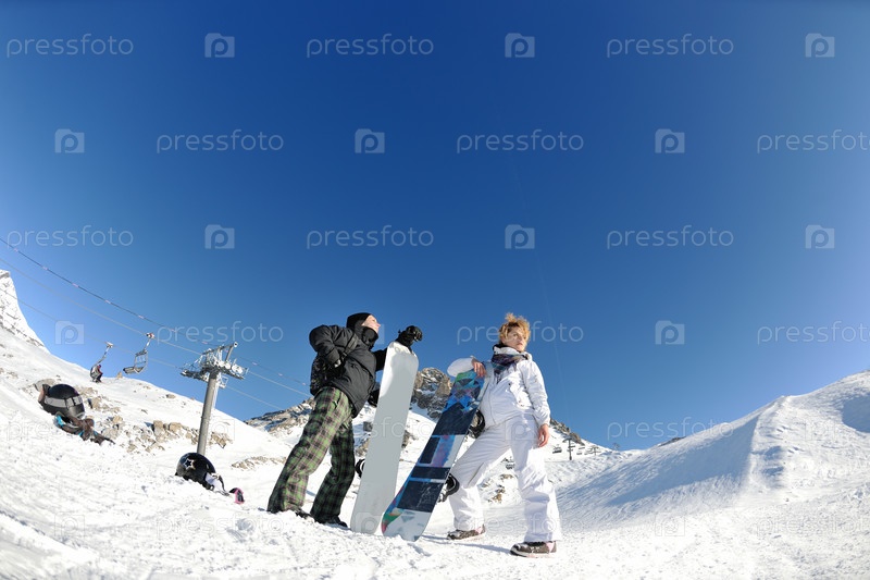 Сноубордистки стоят на горном склоне