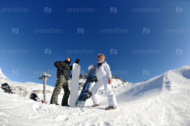 Сноубордистки стоят на горном склоне