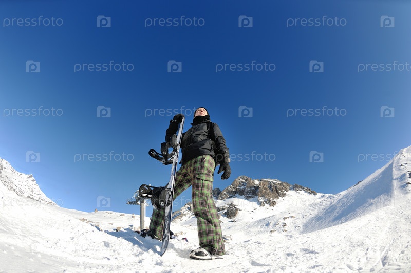 Молодая женщина со сноубордом в горах