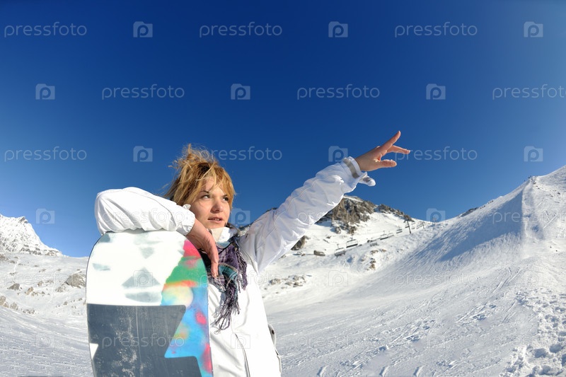 Девушка в зимней одежде со сноубордом в снежных горах