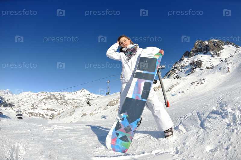 Девушка в зимней одежде со сноубордом в снежных горах