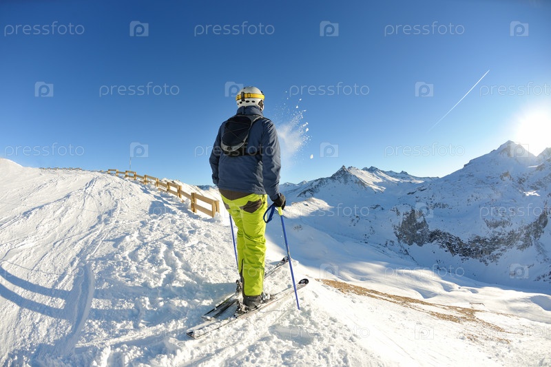 Горнолыжник стоит перед спуском с горы