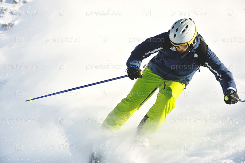 Горнолыжник спускается со снежной горы