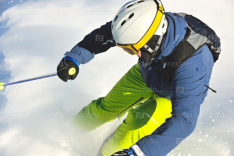 Горнолыжник спускается со снежной горы