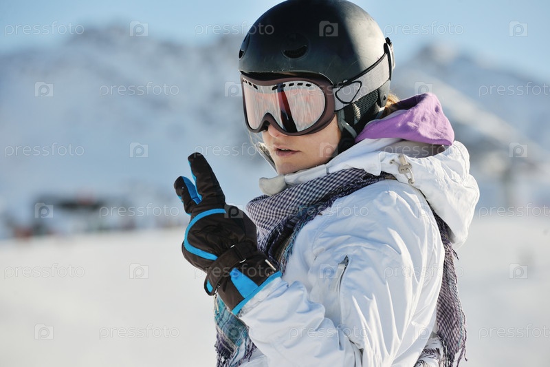 Девушка в горнолыжном костюме показывает знак победы в снежных горах