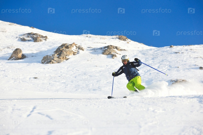 Горнолыжник спускается со снежной горы