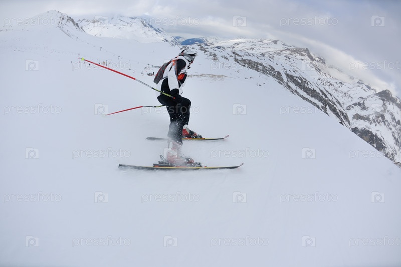 Горнолыжник едет по снежным горам