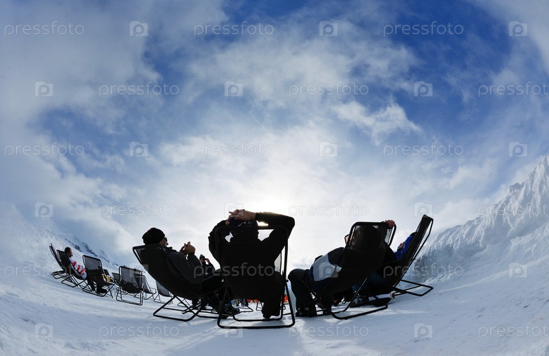 Группа людей отдыхает в креслах в снежных горах