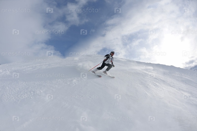Горнолыжник едет по снежным горам
