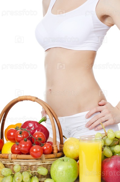 Девушка в белом нижнем белье с фруктами и соком на белом фоне