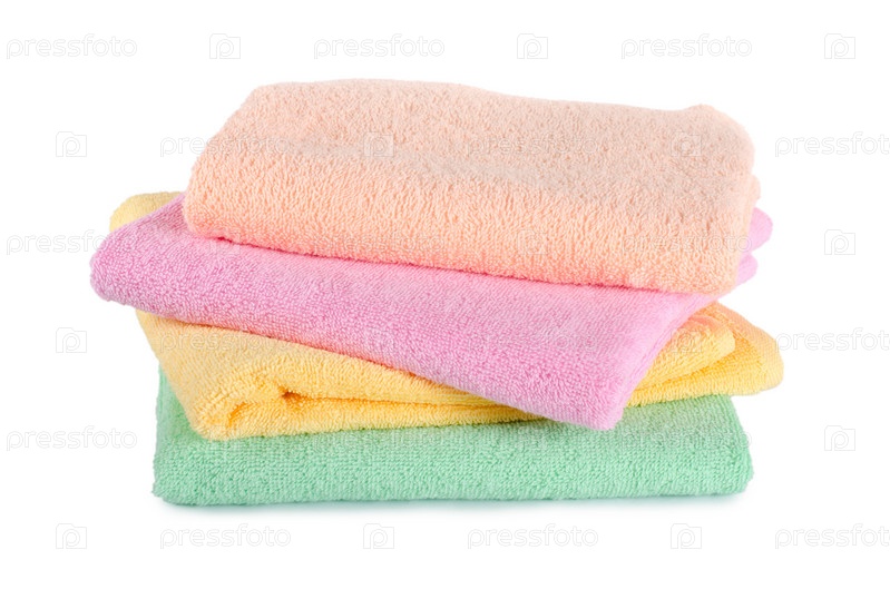 Стопка цветных махровых полотенец на белом фоне