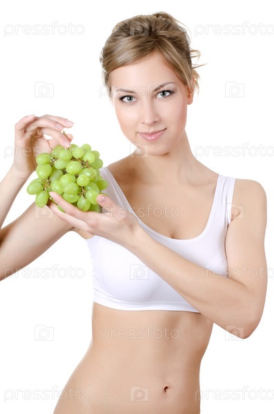 Красивая девушка с зеленым виноградом в руках