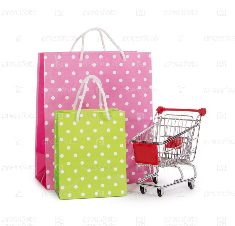 Корзина и сумки для покупок на белом фоне