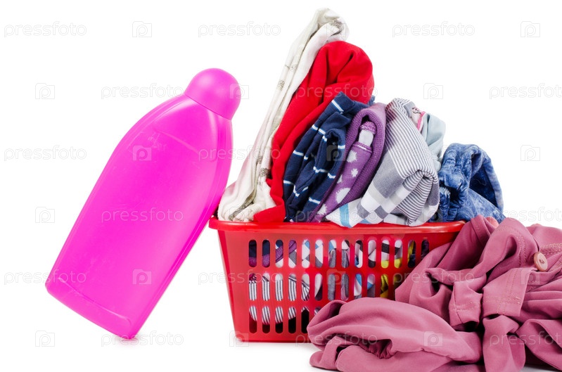 Куча чистой одежды и средство для стирки на белом фоне