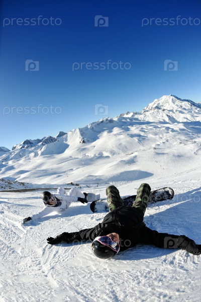 Сноубордистки отдыхают на склоне горы