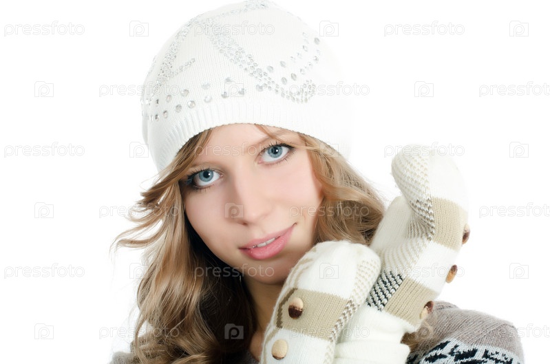 Красивая девушка в варежках, изолировано на белом фоне