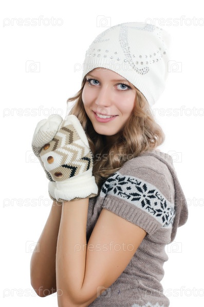 Красивая девушка в варежках, изолировано на белом фоне