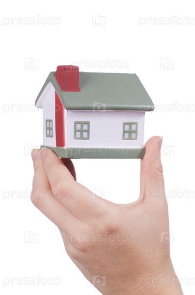 Игрушечный дом в руке на белом фоне