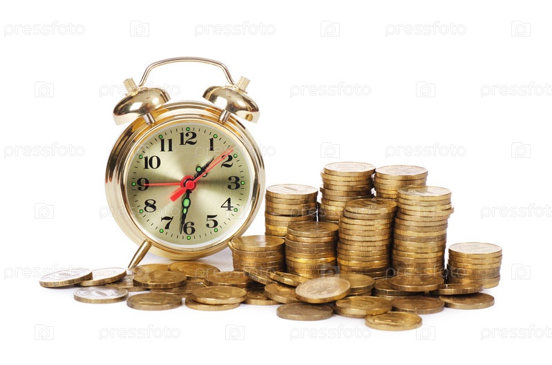 Будильник и деньги на белом фоне