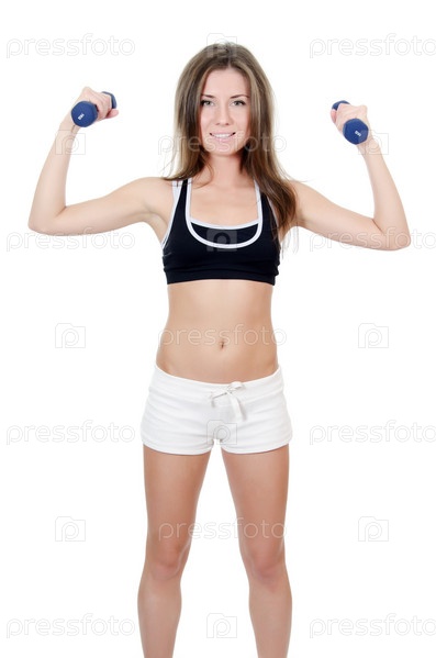 Девушка занимается с гантелями