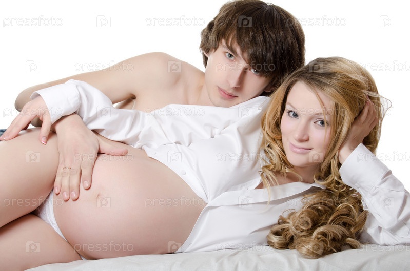 Красивая беременная женщина с мужем на белом фоне