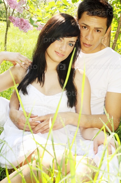 Красивая пара под кустом цветущей сирени