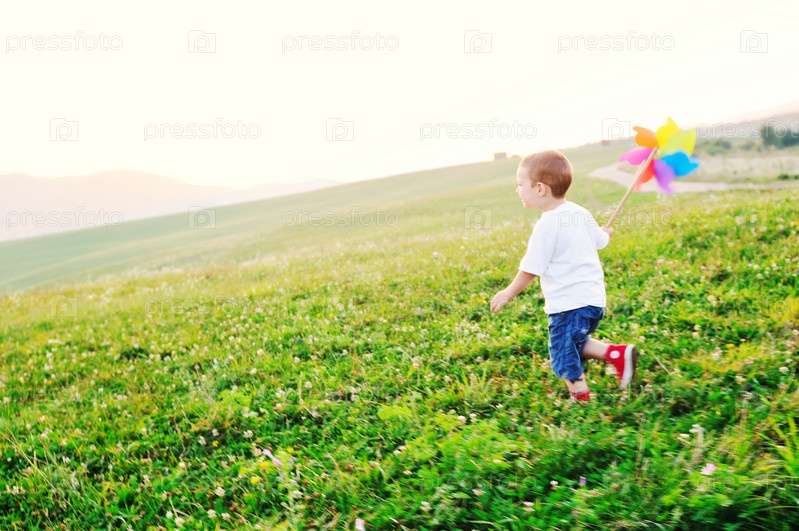 Счастливый ребенок с ветрячком в поле, вечер