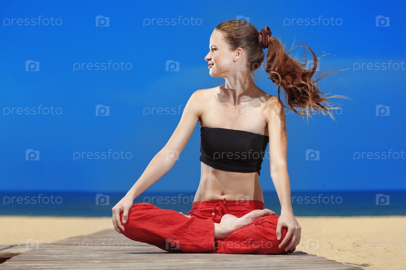 Молодая красивая женщина делает зарядку на пляже