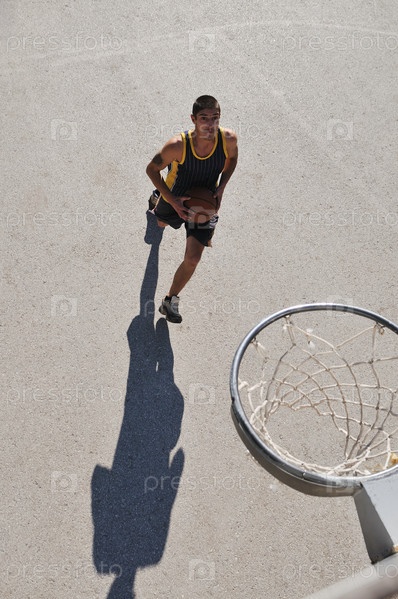 Подросток играет в баскетбол на открытом воздухе