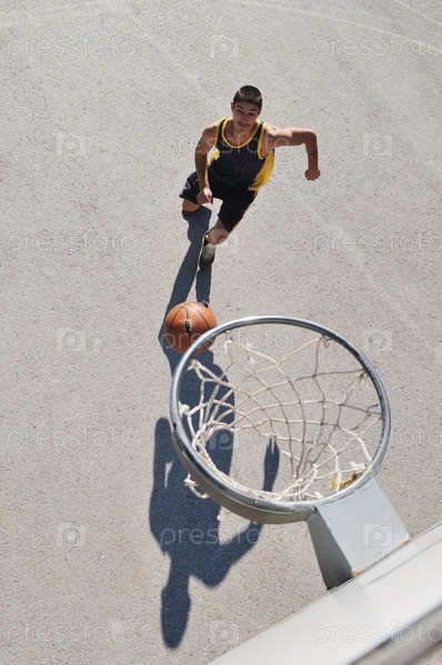 Подросток играет в баскетбол на открытом воздухе