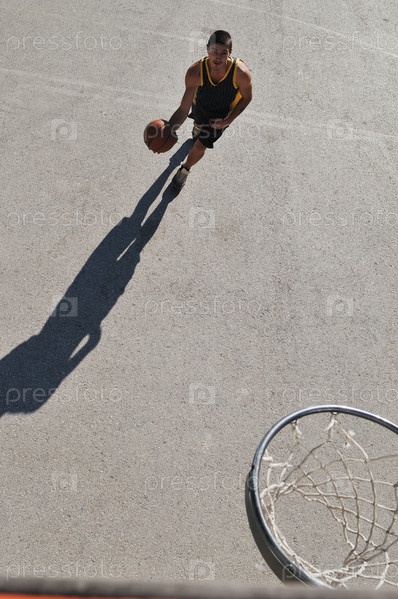 Подросток играет в баскетбол на открытом воздухе