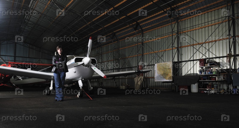 Красивая молодая женщина на фоне частного самолета