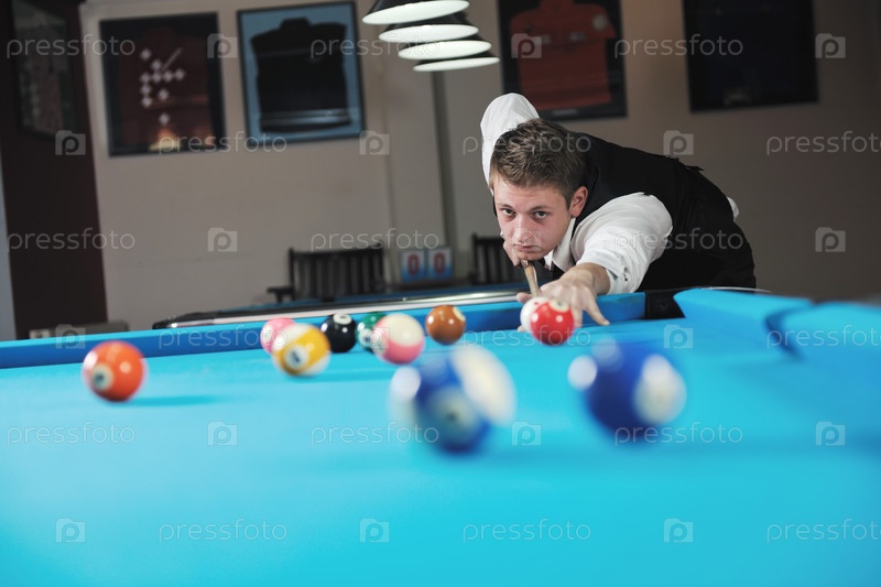 Молодой человек играет в бильярд