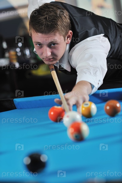 Молодой человек играет в бильярд