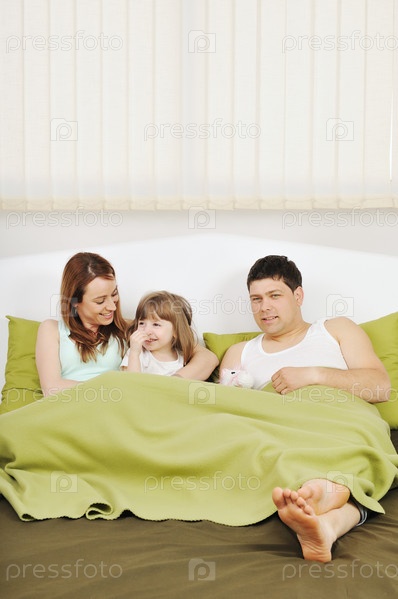 Счастливая молодая семья в кровати