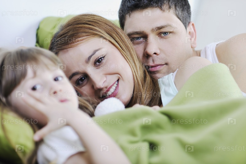 Счастливая молодая семья в кровати
