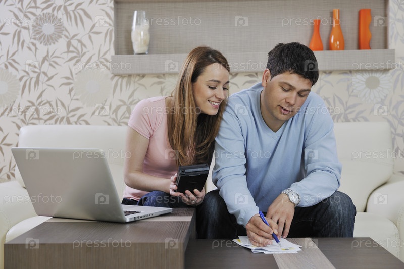 Молодая пара на диване с ноутбуком в гостиной