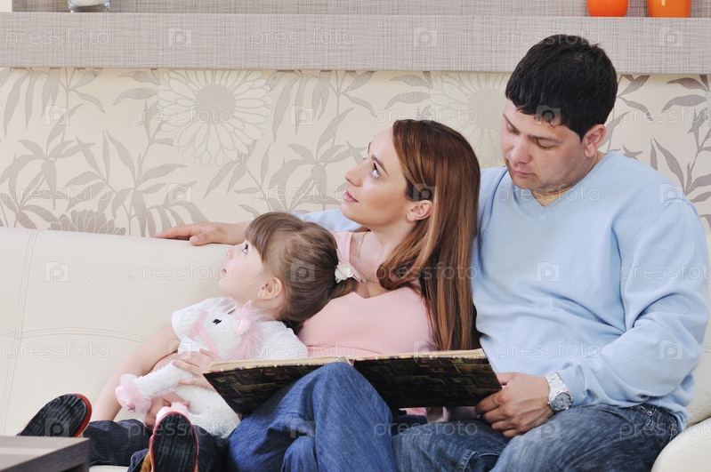 Счастливая молодая семья на диване в гостиной