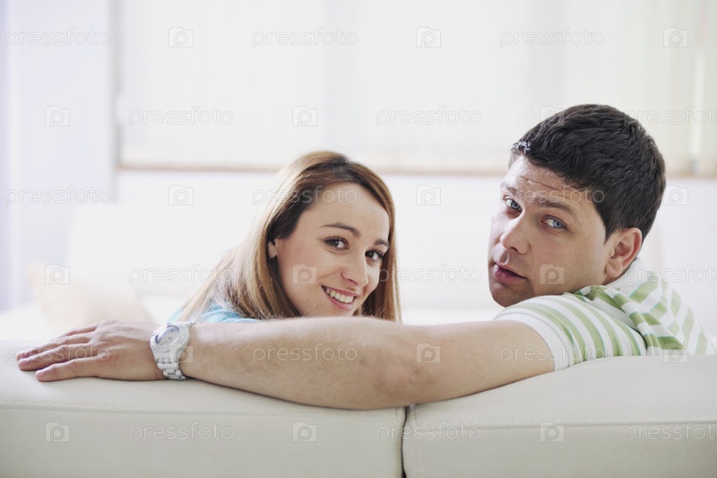 Молодая пара сидит на диване в гостиной