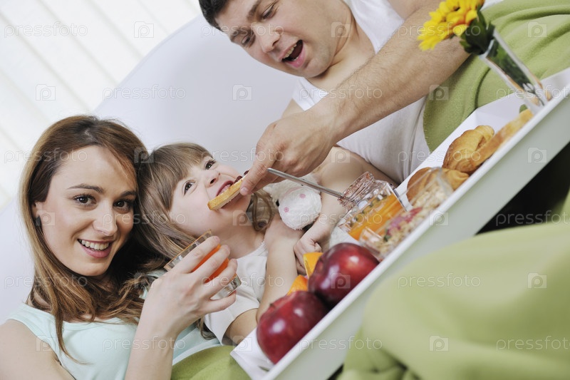 Молодая семья в постели с завтраком