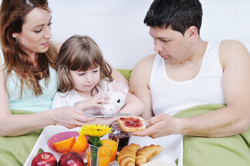 Молодая семья в постели с завтраком