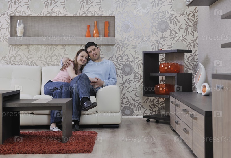 Молодая пара сидит на диване в гостиной