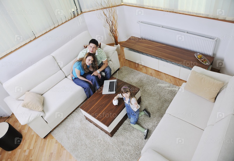 Молодая счастливая семья в гостиной